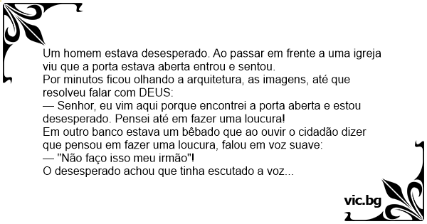 Um homem estava desesperado. Ao passar em frente a uma igreja viu que a porta estava aberta entrou e sentou.