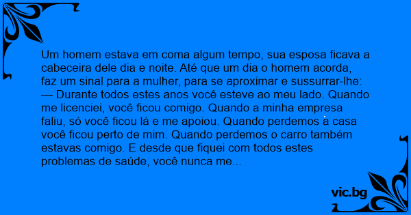 — Durante todos estes anos você esteve ao meu lado. Quando me licenciei, você ficou comigo. Quando a minha empresa faliu, só você ficou lá e me apoiou. Quando perdemos a casa você ficou perto de mim. Quando perdemos o carro também estavas comigo. E desde que fiquei com todos estes problemas de saúde, você nunca me abandonou. Sabe de uma coisa?
