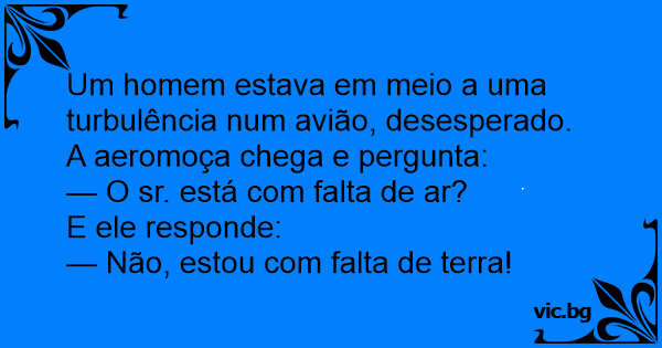 Um homem estava em meio a uma turbulência num avião, desesperado. A aeromoça chega e pergunta: