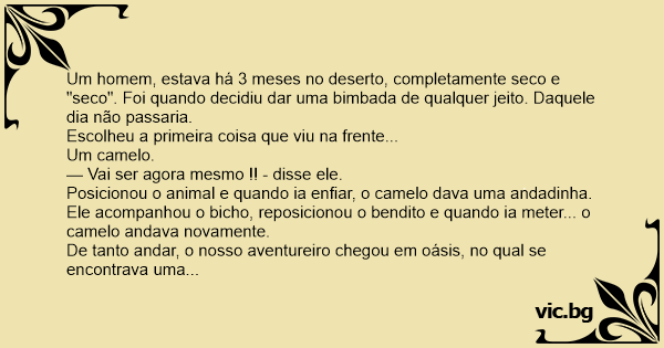 Um homem, estava há 3 meses no deserto, completamente seco e "seco". Foi quando decidiu dar uma bimbada de qualquer jeito. Daquele dia não passaria.