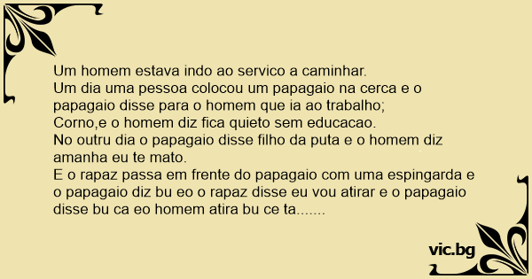 E o rapaz passa em frente do papagaio com uma espingarda e o papagaio diz bu eo o rapaz disse eu vou atirar e o papagaio disse bu ca eo homem atira bu ce ta.......