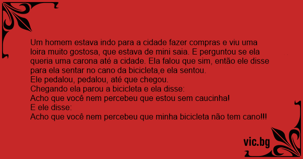 Um homem estava indo para a cidade fazer compras e viu uma loira muito gostosa, que estava de mini saia. E perguntou se ela queria uma carona até a cidade. Ela falou que sim, então ele disse para ela sentar no cano da bicicleta,e ela sentou.