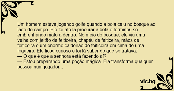 Um homem estava jogando golfe quando a bola caiu no bosque ao lado do campo. Ele foi até lá procurar a bola e terminou se embrenhando mato a dentro. No meio do bosque, ele viu uma velha com jeitão de feiticeira, chapéu de feiticeira, mãos de feiticeira e um enorme caldeirão de feiticeira em cima de uma fogueira. Ele ficou curioso e foi lá saber do que se tratava.