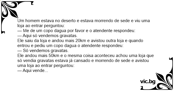 Ele andou mais 50km e o mesma coisa aconteceu achou uma loja que só vendia gravatas estava já cansado e morrendo de sede e avistou uma loja ao entrar perguntou: