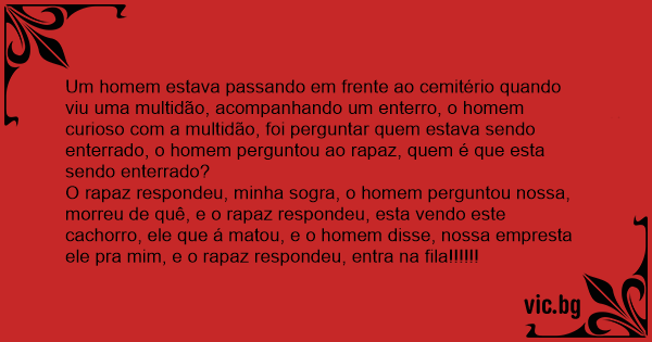 O rapaz respondeu, minha sogra, o homem perguntou nossa, morreu de quê, e o rapaz respondeu, esta vendo este сасhоrrо, ele que á matou, e o homem disse, nossa empresta ele pra mim, e o rapaz respondeu, entra na fila!!!!!!