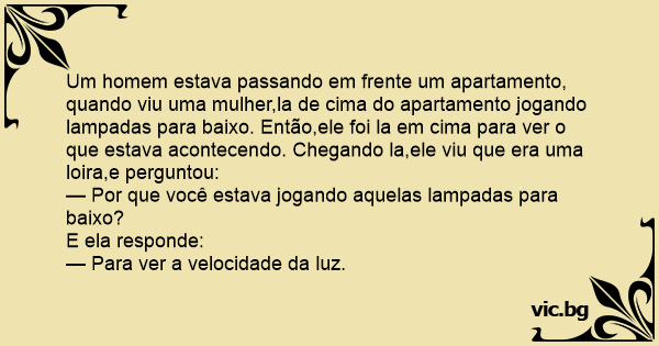 Um homem estava passando em frente um apartamento, quando viu uma mulher,la de cima do apartamento jogando lampadas para baixo. Então,ele foi la em cima para ver o que estava acontecendo. Chegando la,ele viu que era uma loira,e perguntou: