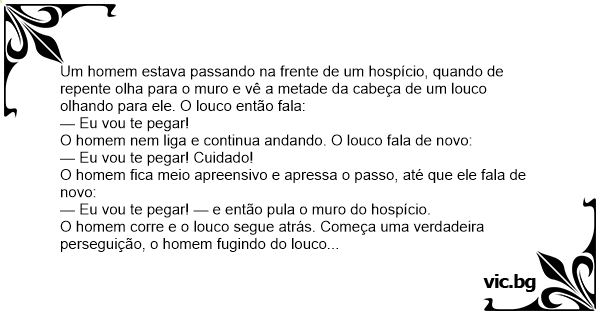 O homem corre e o louco segue atrás. Começa uma verdadeira perseguição, o homem fugindo do louco e o atrás dele cada vez mais perto. Até que chega uma hоrа em que o homem se vê encurralado num beco sem saída, e o louco vai chegando cada vez mais perto. Então o homem fiса desesperado e começa a gritar: