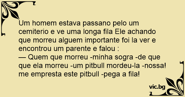 — Quem que morreu -minha sogra -de que que ela morreu -um pitbull mordeu-la -nossa!me empresta este pitbull -pega a fila!