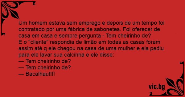 Um homem estava sem emprego e depois de um tempo foi contratado por uma fábrica de sabonetes. Foi oferecer de casa em casa e sempre pergunta - Tem cheirinho de?