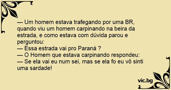 — Um homem estava trafegando por uma BR, quando viu um homem carpinando na beira da estrada, e como estava com dúvida parou e perguntou: