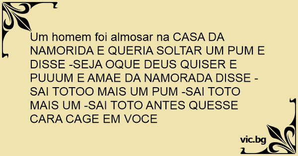 Um homem foi almosar na CASA DA NAMORIDA E QUERIA SOLTAR UM PUM E DISSE -SEJA OQUE DEUS QUISER E PUUUM E AMAE DA NAMORADA DISSE -SAI TOTOO MAIS UM PUM -SAI TOTO MAIS UM -SAI TOTO ANTES QUESSE CARA CAGE EM VOCE