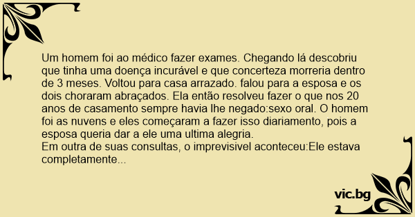Um homem foi ao médico fazer exames. Chegando lá descobriu que tinha uma doença incurável e que concerteza morreria dentro de 3 meses. Voltou para casa arrazado. falou para a esposa e os dois choraram abraçados. Ela então resolveu fazer o que nos 20 anos de casamento sempre havia lhe negado:sеxо оrаl. O homem foi as nuvens e eles começaram a fazer isso diariamento, pois a esposa queria dar a ele uma ultima alegria.