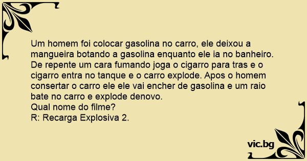 Um homem foi colocar gasolina no carro, ele deixou a mangueira botando a gasolina enquanto ele ia no banheiro. De repente um cara fumando joga o cigarro para tras e o cigarro entra no tanque e o carro explode. Apos o homem consertar o carro ele ele vai encher de gasolina e um raio bate no carro e explode denovo.