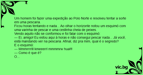 Ficou horas tentando e nada... Ao olhar o horizonte notou um esquimó com uma varinha de pescar e uma cestinha cheia de peixes.