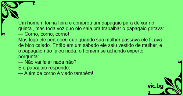 Mas logo ele percebeu que quando sua mulher passava ele ficava de bico calado. Então em um sábado ele saiu vestido de mulher, e o papagaio não falou nada, o homem se achando experto, pergunta: