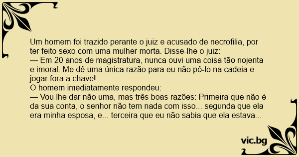 Um homem foi trazido perante o juiz e acusado de necrofilia, por ter feito sеxо com uma mulher morta. Disse-lhe o juiz: