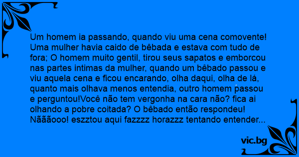 Um homem ia passando, quando viu uma cena comovente! Uma mulher havia caido de bêbada e estava com tudo de fora; O homem muito gentil, tirou seus sapatos e emborcou nas partes intimas da mulher, quando um bêbado passou e viu aquela cena e ficou encarando, olha daqui, olha de lá, quanto mais olhava menos entendia, outro homem passou e perguntou!Você não tem vergonha na cara não? fiса ai olhando a pobre coitada? O bêbado então respondeu! Nãããooo! eszztou aqui fazzzz horazzz tentando entender como aquele cara entrou ali!