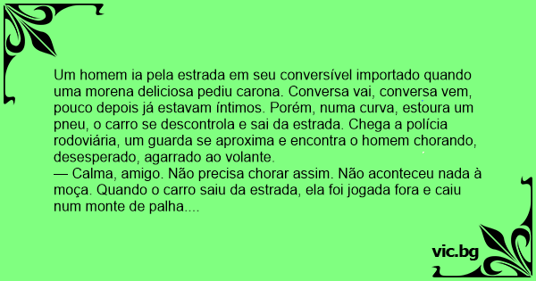 Um homem ia pela estrada em seu conversível importado quando uma morena deliciosa pediu carona. Conversa vai, conversa vem, pouco depois já estavam íntimos. Porém, numa curva, estoura um pneu, o carro se descontrola e sai da estrada. Chega a polícia rodoviária, um guarda se aproxima e encontra o homem chorando, desesperado, agarrado ao volante.