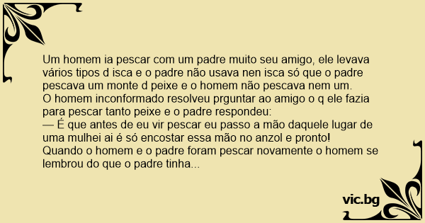 Um homem ia pescar com um padre muito seu amigo, ele levava vários tipos d isca e o padre não usava nen isca só que o padre pescava um monte d peixe e o homem não pescava nem um.