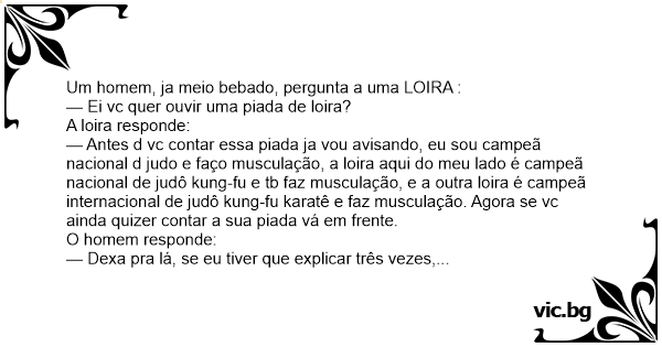 — Antes d vc contar essa piada ja vou avisando, eu sou campeã nacional d judo e faço musculação, a loira aqui do meu lado é campeã nacional de judô kung-fu e tb faz musculação, e a outra loira é campeã internacional de judô kung-fu karatê e faz musculação. Agora se vc ainda quizer contar a sua piada vá em frente.