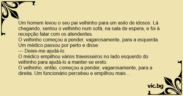 Um homem levou o seu pai velhinho para um asilo de idosos. Lá chegando, sentou o velhinho num sofá, na sala de espera, e foi à recepção falar com os atendentes.