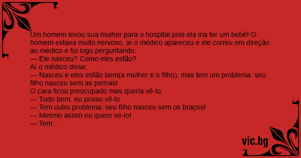 Um homem levou sua mulher para o hospital pois ela iria ter um bebê! O homem estava muito nervoso, aí o médico apareceu e ele correu em direção ao médico e foi logo perguntando: