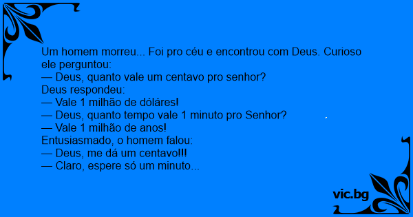 Certa vez um homem pobre que não se conformava com sua condição, rezou muito e conseguiu um contato com Deus. Encontrando Deus, ele pergunta: — Deus, quanto vale para o senhor um minuto? — Para...