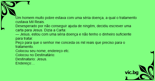 Desesperado por não conseguir ajuda de ningém, decidiu escrever uma carta para Jesus. Dizia a Carta: