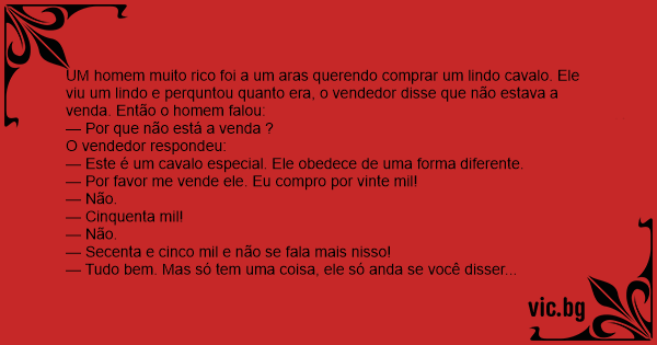 UM homem muito rico foi a um aras querendo comprar um lindo cavalo. Ele viu um lindo e perquntou quanto era, o vendedor disse que não estava a venda. Então o homem falou: