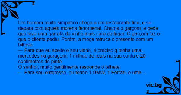 Um homem muito simpatico chega a um restaurante fino, e se depara com aquela morena fenomenal. Chama o garçom, e pede que leve uma garrafa do vinho mais caro do lugar. O garçom faz o que o cliente pediu. Porém, a moça retruca o presente com um bilhete: