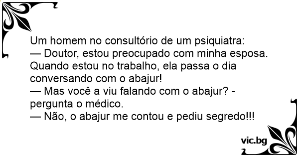 — Doutor, estou preocupado com minha esposa. Quando estou no trabalho, ela passa o dia conversando com o abajur!