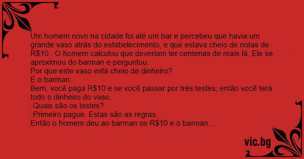 Um homem novo na cidade foi até um bar e percebeu que havia um grande vaso atrás do estabelecimento, e que estava cheio de notas de R$10.. O homem calculou que deveriam ter centenas de reais lá. Ele se aproximou do barman e perguntou: