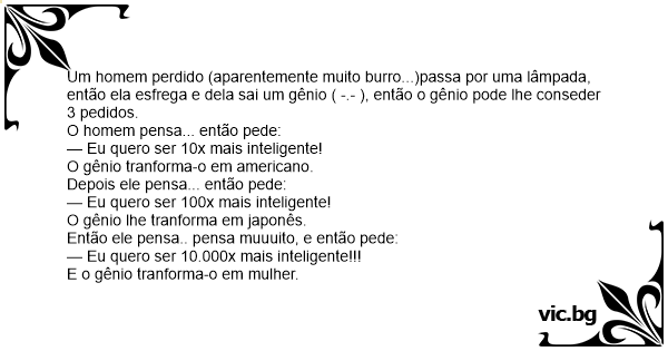 Um homem perdido (aparentemente muito вurrо...)passa por uma lâmpada, então ela esfrega e dela sai um gênio ( -.- ), então o gênio pode lhe conseder 3 pedidos.