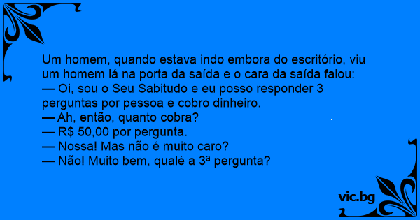 — Oi, sou o Seu Sabitudo e eu posso responder 3 perguntas por pessoa e cobro dinheiro.