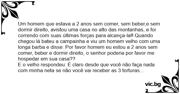 Um homem que estava a 2 anos sem comer, sem beber,e sem dormir direito, avistou uma casa no alto das montanhas, e foi correndo com suas últimas forças para alcança-la!! Quando chegou lá bateu a campainha e viu um homem velho com uma longa barba e disse: Por favor homem eu estou a 2 anos sem comer, beber e dormir direito, o senhor poderia por favor me hospedar em sua casa??