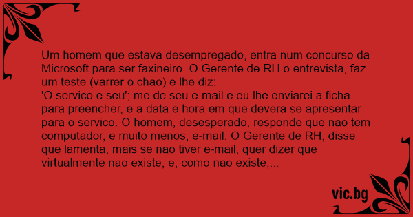 Um homem que estava desempregado, entra num concurso da Microsoft para ser faxineiro. O Gerente de RH o entrevista, faz um теsте (varrer o chao) e lhe diz: