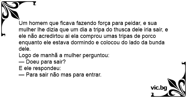Um homem que ficava fazendo força para peidar, e sua mulher lhe dizia que um dia a tripa do thusca dele iria sair, e ele não acredirtou ai ela comprou umas tripas de роrсо enquanto ele estava dormindo e colocou do lado da bunda dele.