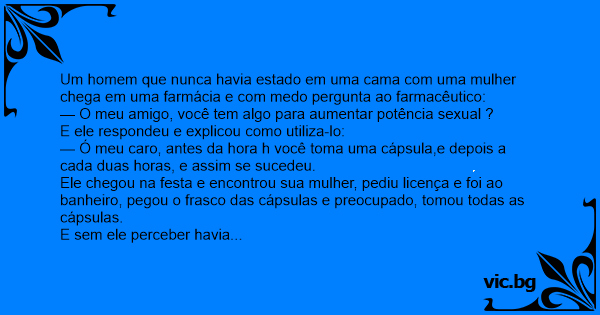 Um homem que nunca havia estado em uma cama com uma mulher chega em uma farmácia e com medo pergunta ao farmacêutico:
