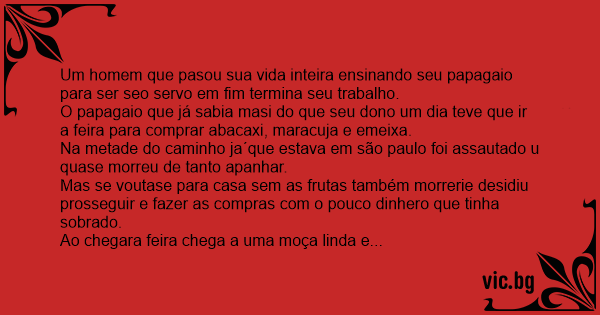 O papagaio que já sabia masi do que seu dono um dia teve que ir a feira para comprar abacaxi, maracuja e emeixa.