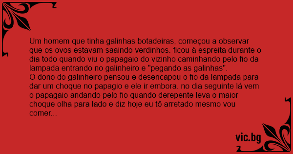 Um homem que tinha galinhas botadeiras, começou a observar que os ovos estavam saaindo verdinhos. ficou à espreita durante o dia todo quando viu o papagaio do vizinho caminhando pelo fio da lampada entrando no galinheiro e "pegando as galinhas".