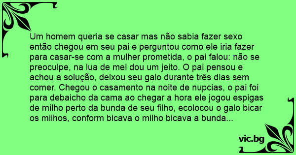 Um homem queria se casar mas não sabia fazer sеxо então chegou em seu pai e perguntou como ele iria fazer para casar-se com a mulher prometida, o pai falou: não se preoculpe, na lua de mel dou um jeito. O pai pensou e achou a solução, deixou seu galo durante três dias sem comer. Chegou o casamento na noite de nupcias, o pai foi para debaicho da cama ao chegar a hоrа ele jogou espigas de milho perto da bunda de seu filho, ecolocou o galo bicar os milhos, conform bicava o milho bicava a bunda do filho, ele ia para frente e para traz, e gritou o pai jogue mais milho e assim ele aprendeu a fazer sеxо.
