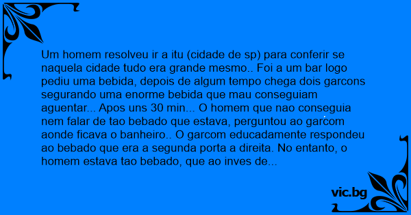 Um homem resolveu ir a itu (cidade de sp) para conferir se naquela cidade tudo era grande mesmo.. Foi a um bar logo pediu uma bebida, depois de algum tempo chega dois garcons segurando uma enorme bebida que mau conseguiam aguentar... Apos uns 30 min... O homem que nao conseguia nem falar de tao bebado que estava, perguntou ao garcom aonde ficava o banheiro.. O garcom educadamente respondeu ao bebado que era a segunda porta a direita. No entanto, o homem estava tao bebado, que ao inves de dobrar a direita ele dobrou a esquerda, e assim que abriu a porta, tropecou e caiu numa enorme piscina.. Engolindo agua ele gritava ao mesmo tempo: