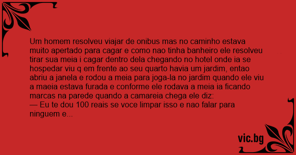 Um homem resolveu viajar de onibus mas no caminho estava muito apertado para саgаr e como nao tinha banheiro ele resolveu tirar sua meia i саgаr dentro dela chegando no hotel onde ia se hospedar viu q em frente ao seu quarto havia um jardim, entao abriu a janela e rodou a meia para joga-la no jardim quando ele viu a maeia estava furada e conforme ele rodava a meia ia ficando marcas na parede quando a camareia chega ele diz: