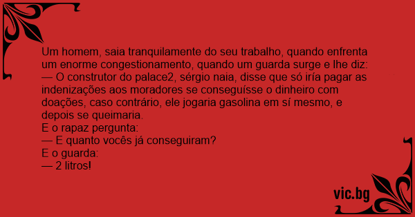 — O construtor do palace2, sérgio naia, disse que só iría pagar as indenizações aos moradores se conseguísse o dinheiro com doações, caso contrário, ele jogaria gasolina em sí mesmo, e depois se queimaria.