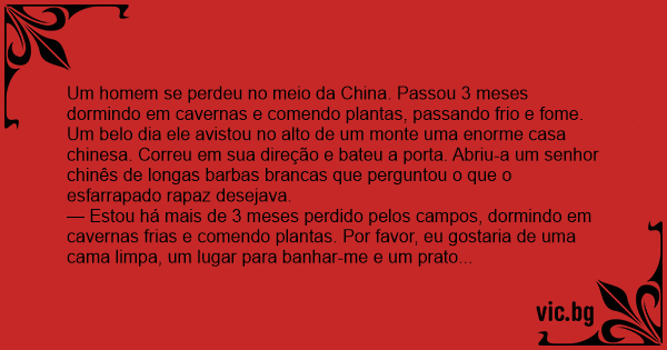 Um belo dia ele avistou no alto de um monte uma enorme casa chinesa. Correu em sua direção e bateu a porta. Abriu-a um senhor chinês de longas barbas brancas que perguntou o que o esfarrapado rapaz desejava.