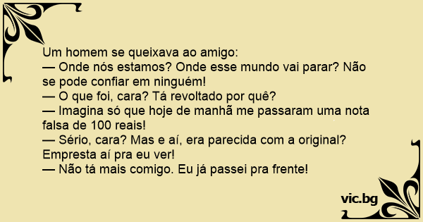 — Imagina só que hoje de manhã me passaram uma nota falsa de 100 reais!