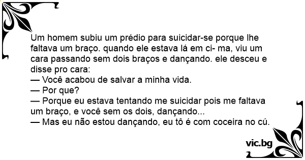Um homem subiu um prédio para suicidar-se porque lhe faltava um braço. quando ele estava lá em ci- ma, viu um cara passando sem dois braços e dançando. ele desceu e disse pro cara: