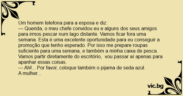 — Querida, o meu chefe convidou eu e alguns dos seus amigos para irmos pescar num lago distante. Vamos ficar fora uma semana. Esta é uma excelente oportunidade para eu conseguir a promoção que tenho esperado. Por isso me prepare roupas suficiente para uma semana, e também a minha caixa de pesca. Vamos partir diretamente do escritório, vou passar aí apenas para apanhar essas coisas.