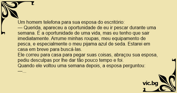 — Querida, apareceu a oportunidade de eu ir pescar durante uma semana. É a oportunidade de uma vida, mas eu tenho que sair imediatamente. Arrume minhas roupas, meu equipamento de pesca, e especialmente o meu pijama azul de seda. Estarei em casa em breve para buscá-las.