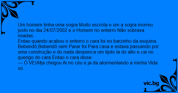Nunca irrite sua sogra ! O homem foi ao enterro de sua sogra,acabando o velório ele estava voltando alégre para quando passou embaixo de um prédio em construção e foi quando um tijolo caiu em sua...